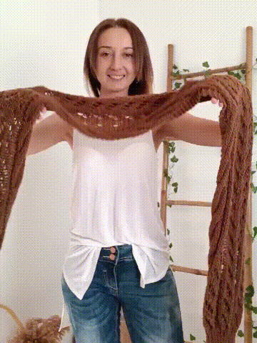 The sweater scarf with sleeves is knitted with two needles using an openwork stitch simulating spikes and braids at the top and bottom, with a high-quality durable soft knitting Rayon.
